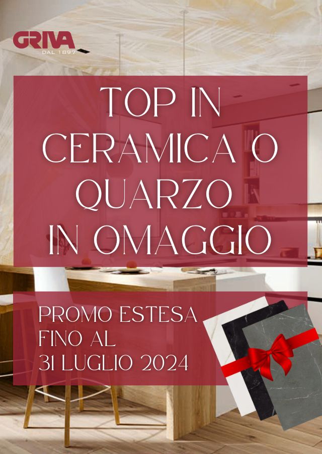 Grazie al Coupon potrai avere il top tecnico in ceramica o quarzo a costo zero, con l’acquisto di una cucina PRATICA del valore minimo di 7.000 €, completa di 4 elettrodomestici. I top tecnici offerti sono resistenti ai raggi UV, alla flessione, al gelo e al disgelo, all'abrasione e ai prodotti chimici, garantendo durata e qualità nel tempo.