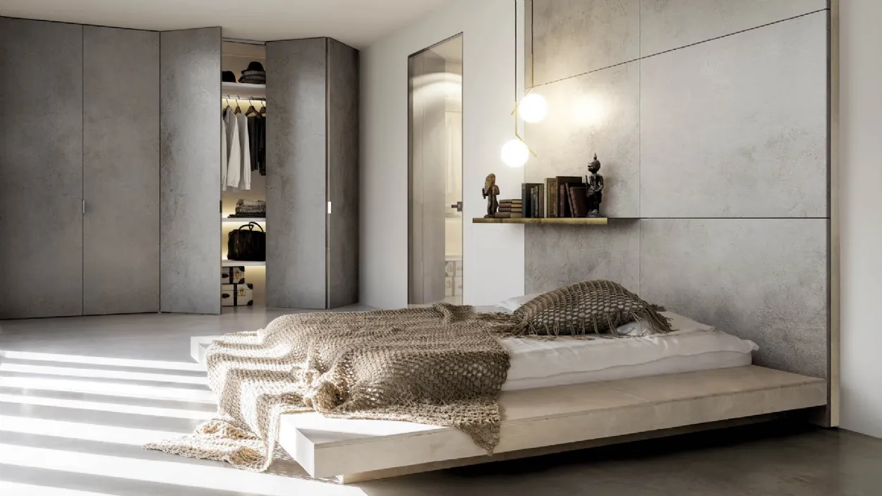 Le cabine armadio Doal possono essere realizzate con chiusura frontale con ante scorrevoli e una struttura interna con montanti in alluminio, il tutto declinato con un design minimalista e moderno.