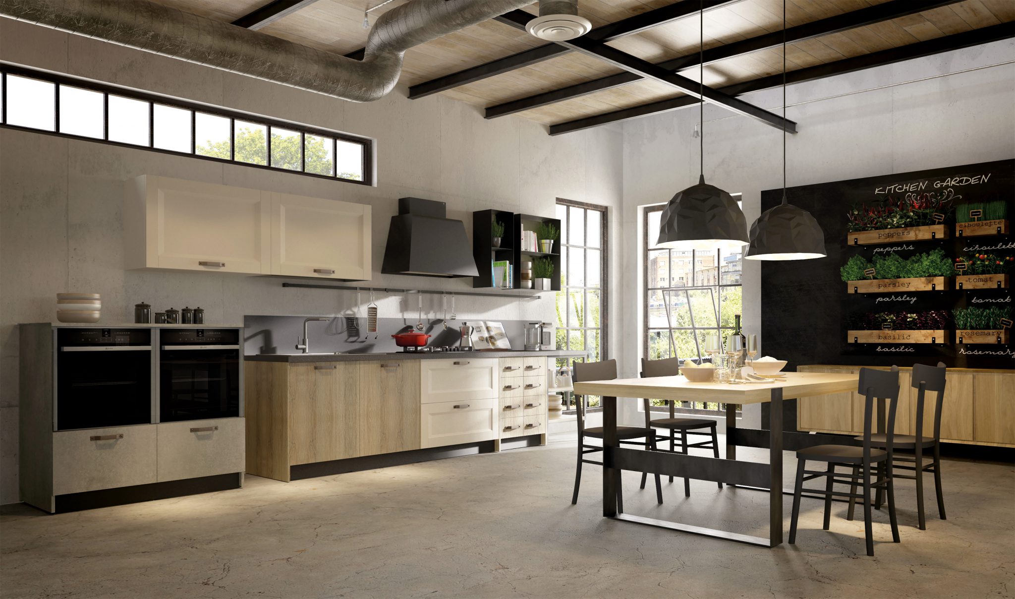 Materiali grezzi, dal legno ai metalli ossidati, grandi scaffalature e linee essenziali danno l’imprinting industriale a questa tipologia di cucina. Non ha bisogno di grandi ambienti per esprimere tutte le sue potenzialità. Anzi, grazie a moduli compatti e superattrezzati è capace di adattarsi a qualsiasi esigenza di spazio.L’importante è crearvi all’interno dei veri e propri “mix d’effetto”. L’aspetto vissuto dei materiali, il legno delle ante, il metallo finitura peltro o ferro di alcuni contenitori e della cappa, i vetri retinati in finitura bronzo, danno al progetto una forte connotazione metropolitana. L’abile composizione di tutti questi elementi consente di ottenere diverse interpretazioni della cucina: industriale ma che punta all’eleganza della sua originalità. Attenzione nei dettagli: dal carattere decisamente industriale sono le nuove maniglie in metallo anticato che spesso adornano le ante troppo “minimal” e i contenitori a giorno, spesso in metallo o laccati in finitura peltro. Una risposta concreta ai problemi di spazio delle cucine “industrial” la offrono gli armadi “container” con zoccolo color peltro per la massima resa estetica: una stanza nella stanza che può nascondere la lavanderia, la dispensa e tutto quanto non si abbinerebbe troppo bene con questo stile così particolare.